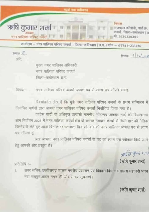 कवर्धा क्षेत्र में कांग्रेस की हार के बाद नगर पालिका अध्यक्ष ऋषि शर्मा ने अपने पद से इस्तीफा दे दिया. बहुत जल्द नए अध्यक्ष पद का चुनाव होगा. कांग्रेस पार्षद ही नगर पालिका अध्यक्ष बन सकते हैं.