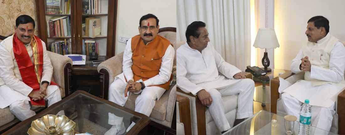 लाल घाटी स्थित वीआईवी विश्रामगृह सुबह पूर्व मुख्यमंत्री कमलनाथ ने मोहन यादव से मुलाकात कर उन्हें बधाई और शुभकामनाएं दी। इसके बाद डॉ मोहन यादव ने पूर्व गृह मंत्री नरोत्तम मिश्रा से उनके निवास पर जाकर मुलाकात दी। मिश्रा ने उन्हें गुलदस्ता देकर उनका स्वागत किया और उन्हें बधाई तथा शुभकामनाए दी।