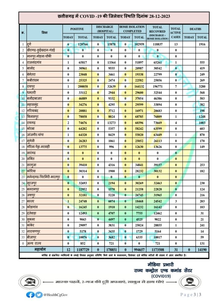 गुरुवार को जिला स्वास्थ्य विभाग ने 178 लोगों का सैंपल लिया जिसमें 78 लोगों का आरटीपीसीआर सैंपल और 131 लोगों का रैपिड कोरोना जांच हुआ. आंकड़ों के मुताबिक दुर्ग में 3 और भिलाई में 3 कोरोना पॉजिटिव मिले. भिलाई के कैंप वन में रहने वाली 81 साल के बुजुर्ग की सेक्टर 9 अस्पताल में इलाज के दौरान मौत भी हो गई. मृतक की जांच रिपोर्ट अस्पताल के मुताबिक कोरोना पॉजिटिव थी. बुजुर्ग कई और बिमारियों से से पीड़ित थे. इलाज के दौरान उन्होने दम तोड़ दिया.