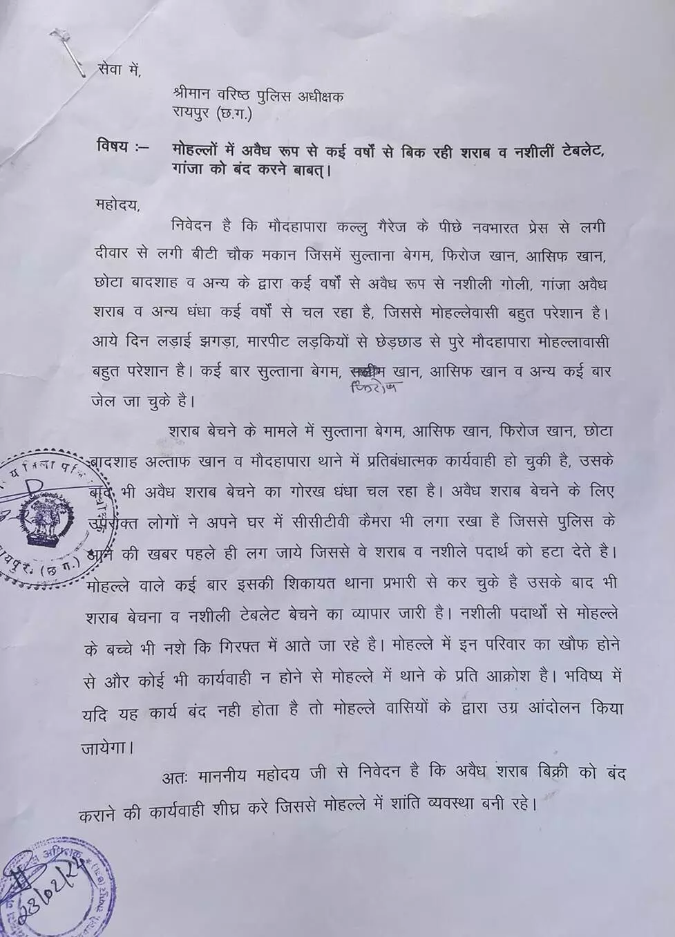रायपुर एसपी से मौदहापारा के स्थानीय लोगों ने गंभीर शिकायत की है। और अपने शिकायत में बताया कि मौदहापारा कल्लु गैरेज के पीछे नवभारत प्रेस से लगी दीवार से लगी बीटी चौक मकान जिसमें सुल्ताना बेगम, फिरोज खान, आसिफ खान, छोटा बादशाह व अन्य के द्वारा कई वर्षों से अवैध रूप से नशीली गोली, गांजा अवैध शराब व अन्य धंधा कई वर्षों से चल रहा है, जिससे मोहल्लेवासी बहुत परेशान है। आये दिन लड़ाई झगड़ा, मारपीट लड़कियों से छेड़छाड से पुरे मौदहापारा मोहल्लावासी बहुत परेशान है। कई बार सुल्ताना बेगम, सलीम खान, आसिफ खान व अन्य कई बार फिरोज जेल जा चुके है।