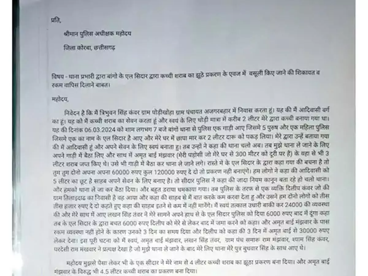कोरबा जिले के बांगो थाने में पदस्थ ASI केएल सिदार के खिलाफ कच्ची शराब का झूठा मामला बनाकर इसके एवज में वसूली किए जाने की शिकायत हुई है। इससे पहले इन पर बालको थाने में रहते हुए गेंदा के पौधों को गांजा बताकर 50 हजार रुपए ऐंठने का भी आरोप है। तब तत्कालीन एएसपी यू उदय किरण ने रुपये पीड़ित को वापस करवाए थे। जानकारी के मुताबिक, बांगो थाना पुलिस की टीम 6 मार्च को बांगो बस्ती में अवैध महुआ शराब पकड़ने गई थी। टीम में 5 पुरुष पुलिसकर्मी और एक महिला पुलिस शामिल थी। इनमें से एक ASI केएल सिदार भी थे। एसपी सिद्धार्थ तिवारी के पास पहुंचे बांगो बस्ती के लोगों ने बताया कि केएल सिदार ने उन्हें कच्ची शराब के झूठे मामले में फंसाने की धमकी दी।