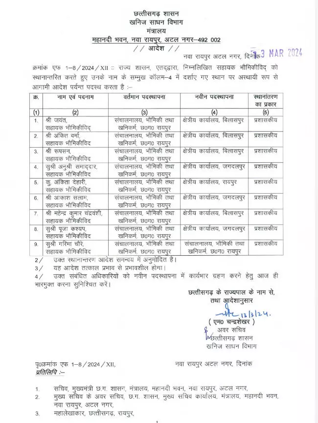रायपुर। खनिज विभाग ने नौ सहायक भौमिकीविद को चयन और परीविक्षावधि पूरी करने के बाद पहली पोस्टिंग दी है ।इन्हे तत्काल रिलीव कर नयी जगह कार्यभार लेने कहा गया है।