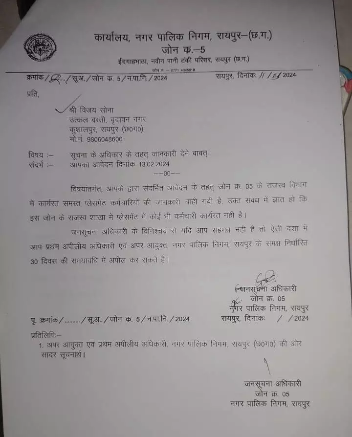 रायपुर नगर निगम रायपुर में फर्जी कर्मचारियों का मामला प्रकाश में आया है अर्थात कमर्चारी नहीं है फिर भी रोजाना कार्यालय में आकर टेबल कुर्सी पर बैठकर कार्य करते है. जोन क्रमांक 5 के राजस्व विभाग में 7 ऐसे फर्जी कर्मचारी कार्य कर रहे है. जिनका न तो जोन कार्यालय के कर्मचारियों की सूचि में नाम है और न ही इनको रखने का आदेश है. यह सब कार्य राजस्व अधिकारी के संरक्षण में हो रहा है. वैसे भी जोन क्रमांक 5 में फर्जीवाड़ा बहुत है. और कोई कुछ किसी को बोलने वाला भी नहीं है. कुल मिलाकर अंधेर नगरी चौपट राजा है.