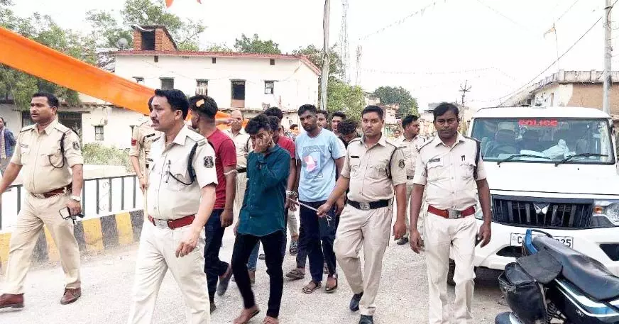 सारंगढ़। बिलाईगढ़ नगर में पहली बार आरोपियों का जुलूस निकाला गया है। वरिष्ठ अधिकारियों के निर्देशन पर आदर्श आचार संहिता में शांति व्यवस्था बनाए रखना जिले में घटित अपराधों की रोकथाम हेतु आवश्यक दिशा निर्देश दिए गए ,जिसके पालन में थाना प्रभारी उप निरीक्षक शिव कुमार धारी के नेतृत्व में थाना बिलाईगढ़ पुलिस द्वारा बलवा करने वाले 8 आरोपियों को गिरफ्तार कर नगर में जुलूस निकाला गया और जेल भेजा गया।