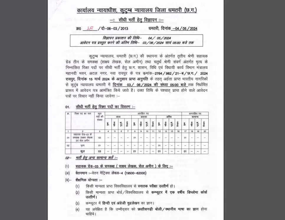 धमतरी। कुटुंब न्यायालय धमतरी (छ.ग.) की स्थापना के अंतर्गत तृतीय श्रेणी सहायक ग्रेड 3 के समकक्ष (साक्ष्य लेखक, सेल अमीन) और चतुर्थ श्रेणी संवर्ग के अंतर्गत भृत्य के उन्नत सहायक ग्रेड 3 के समकक्ष संक्षिप्त भर्ती छत्तीसगढ़ शासन,विधि एवं संप्रदाय के तहत आवेदन आमंत्रित की गई है.