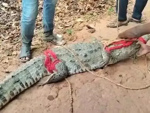 दंतेवाड़ा जिले में वन विभाग की टीम ने एक मगरमच्छ का रेस्क्यू किया है। जिसे इंद्रावती नदी में सुरक्षित छोड़ दिया गया। बताया जा रहा है कि, मगरमच्छ गांव के तालाब में घुस गया था। जिससे गांव के लोग दहशत में थे। मामला जिले के गुटोली गांव का है। दरअसल, इस गांव के ग्रामीणों ने बताया कि, एक तालाब है, जिस पर पूरा गांव निर्भर है। कुछ दिन पहले इस तालाब में एक मगरमच्छ को देखा गया था। जिसके बाद से गांव के लोग तालाब के नजदीक जाने से डरते थे। इसकी जानकारी गीदम वन विभाग को दी गई। जानकारी मिलने के बाद गीदम वन विभाग की टीम मगरमच्छ का रेस्क्यू करने के लिए गई। बुधवार को दिनभर मगरमच्छ का रेस्क्यू किया गया। वन विभाग की टीम ने ग्रामीणों की मदद से मगरमच्छ को पकड़कर इंद्रावती नदी में छोड़ दिया है। बताया जा रहा है कि, इससे पहले भी इस इलाके से मगरमच्छ को पकड़ा गया था।