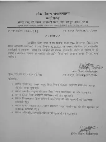 डीपीआई दिव्या मिश्रा द्वारा जारी आदेश के अनुसार 1 अगस्त 2024 से सभी खंड शिक्षा अधिकारी कार्यालयों में तथा 12 अगस्त 2024 से समस्त शैक्षणिक एवं प्रशासकीय कार्यालयों में अवकाश प्राप्ति एवं स्वीकृत की प्रक्रिया ऑनलाइन पोर्टल के माध्यम से की जावेगी उपरोक्त दिनांक के पश्चात ऑफलाइन किया गया आवेदन स्वमेव निरस्त माना जाएगा।