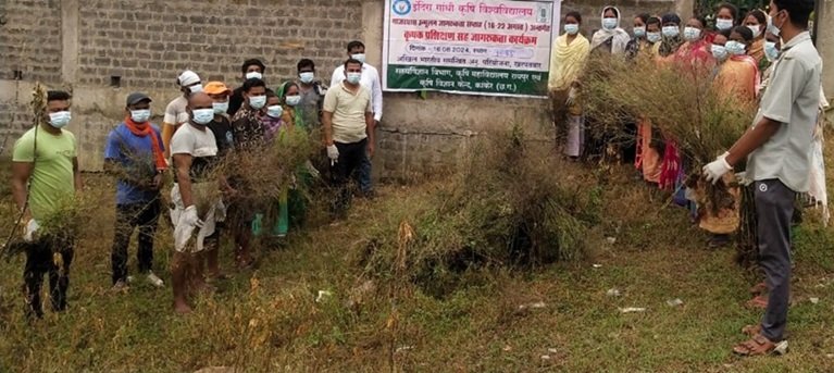 कांकेर । गाजर घास उन्मूलन जागरूकता सप्ताह का आयोजन 16 से 22 अगस्त तक कृषि विज्ञान केन्द्र कांकेर एवं अखिल भारतीय समन्वित अनुसंधान परियोजना खरपतवार प्रबंधन के तत्वावधान में किया गया। इसके तहत गाजरघास उन्मूलन हेतु ग्राम पुसवाड़ा एवं सिंगारभाट में जागरूकता कार्यक्रम का आयोजन किया गया। कार्यक्रम के प्रारम्भ में इंदिरा गांधी कृषि विश्वविद्यालय के वरिष्ठ वैज्ञानिक डॉ. नितीश तिवारी ने गाजर घास के बारे में विस्तृत जानकारी देते हुए बताया कि गाजरघास का प्रकोप पिछले कुछ वर्षों से सभी प्रकार की खाद्यान्न फसलों, सब्जियां एवं उद्यानों में भी बढ़ता जा रहा है। गाजरघास का पौधा 3-4 महीने में अपना जीवन चक्र पूरा कर लेता है तथा एक वर्ष में इसकी 3-4 पीढ़िया पूरी होती जाती है।