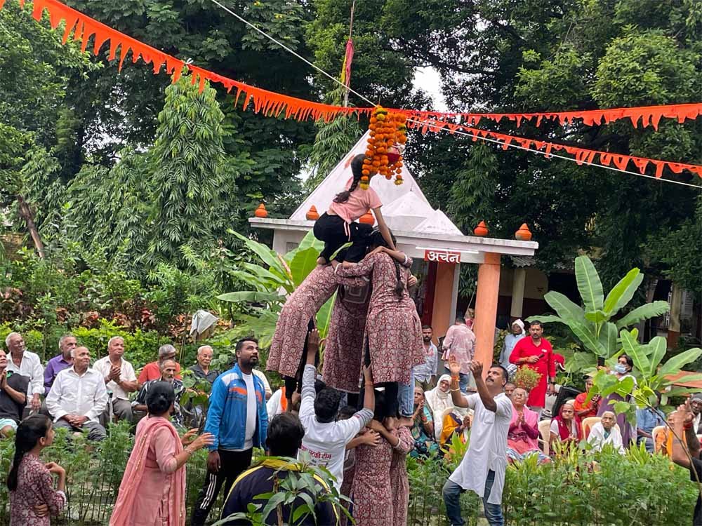 संग मटकी फोड़ के साथ राधा कृष्ण की मनमोहक झांकी एवं नृत्य की प्रस्तुति कर बिटियाओं ने मटकी फोड़ी।