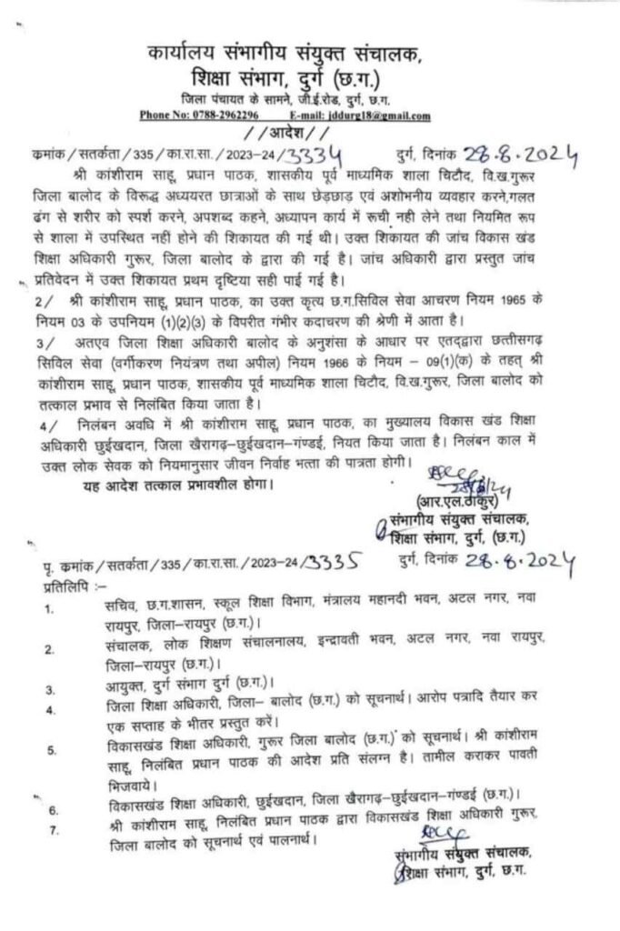 बालोद. छात्राओं से छेड़छाड़ और अपशब्दों का प्रयोग करने वाले चिटौद स्कूल के प्रधानपाठक कांसीराम साहू को सस्पेंड कर दिया गया है. यह मामला शासकीय माध्यमिक विद्यालय चिटौद विकासखंड गुरुर, जिला बालोद का है.