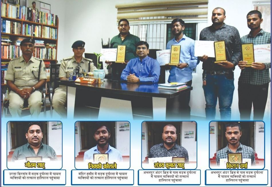 01. किशन वर्मा पिता मनोज वर्मा उम्र 24 वर्ष अभनपुर जिला रायपुर द्वारा दिनांक 25.07.2024 को अभनपुर अंडर ब्रिज के पास घटित सड़क दुर्घटना में मो.सा. चालक व सवार व्यक्ति गंभीर रूप से घायल हो गये थे। एम्बुलेंस को कॉल किया परन्तु विलंब होते देख स्वयं के वाहन से उपचार हेतु हास्पिटल भेजकर घायल की जान बचाने में अपनी महत्वपूर्ण भूमिका निभाई।