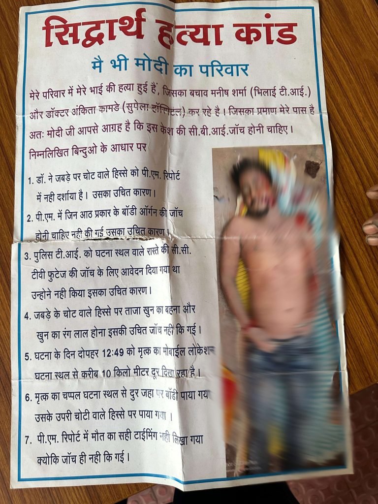 शम्भूनाथ का आरोप है कि उसके भाई सिद्धार्थ ढोल की मौत हत्या की साजिश के तहत हुई है. उसने कहा कि भिलाई 3 के थाना प्रभारी मनीष शर्मा और पोस्टमार्टम करने वाले डॉक्टर अंकिता कामड़े ने पूरे मामले को दबाने की कोशिश की है, जिसका खुलासा एक-एक करके हो रहा है. पोस्टमार्टम गलत पेश किया गया है यह तो साबित हो गया है, थाना प्रभारी ने सही जांच नहीं की. थाना प्रभारी को जिस रास्ते से ये चारों गए थे उस रास्ते का CCTV फ़ुटेज निकालने को कहा गया था तो धमकी दी जा रही थी कि तुम्हें जेल के अंदर कर दूंगा.