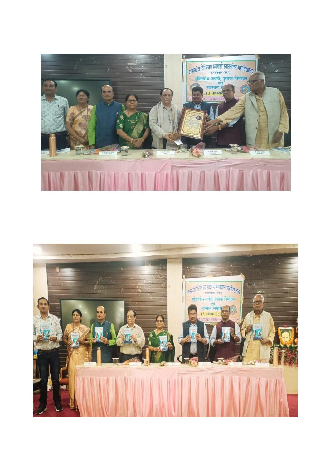 इस अवसर पर डॉ बीएन जागृत और डॉ प्रवीण कुमार साहू द्वारा संपादित पुस्तक वैश्विक परिप्रेक्ष्य में नारी विमर्श का विमोचन किया गया और दिग्विजय महाविद्यालय के तीन पदोन्नत प्राचार्य डॉ अंजना ठाकुर, शबनम खान और डीपी कुर्रे का अभिनंदन करते हुए विदाई दी गई।
