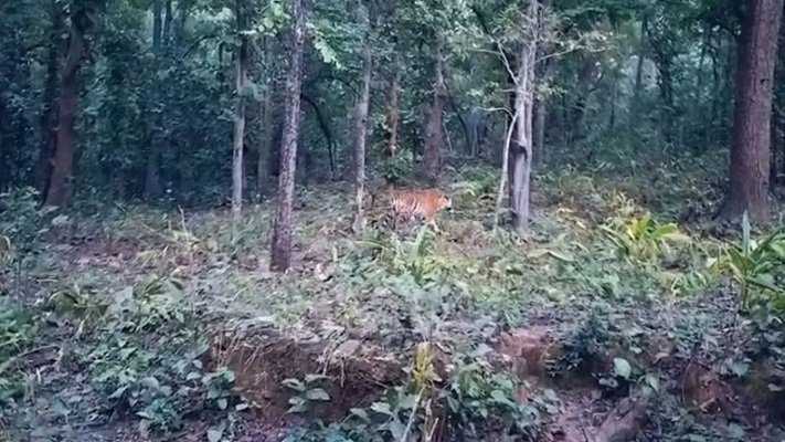 इसके साथ ही पर्यटकों ने जंगल के बीच झाड़ियों से बाघ को निकलते देखा। जिसे उन्होंने अपने कैमरे में कैद कर लिया। अब बाघ की तस्वीरें सोशल मीडिया में वायरल भी हो रहा है।
