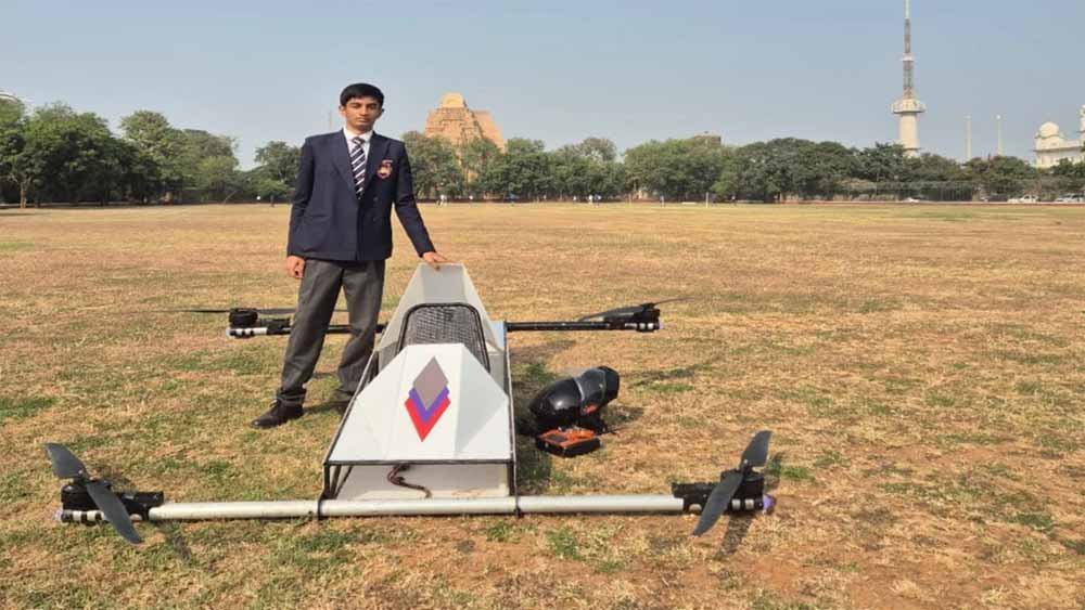 सिंधिया स्कूल फोर्ट के छात्र मेधांश त्रिवेदी ने मानव ड्रोन तैयार किया है, जो एक व्यक्ति को बैठाकर उड़ने भरने में सक्षम है। कक्षा 12वीं के छात्र मेधांश ने इस ड्रोन का नाम एमटीएलडी-01 नाम दिया है। मेधांश बताते हैं कि इस ड्रोन को बनाने में तीन माह का समय लगा। इस दौरान कई बार असफलता भी हाथ लगी। इसमें लगभग चार लाख रुपये खर्च आया है। इस ड्रोन का खाली वजन 32 किलोग्राम है और उड़ान का समय आठ मिनट है। यह ड्रोन कुल 50 हार्सपावर का है, जो ट्रैक्टर से भी ज्यादा ताकतवर है। मेधांश ने बताया कि यह ड्रोन चार किलोमीटर की ऊंचाई तक जा सकता है। ड्रोन की अधिकतम गति 80 किलोमीटर प्रति घंटा है।