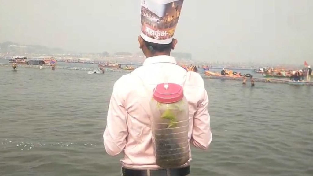 मुंह-नाक में मास्क लगाकर भोज साहू पर्यावरण संरक्षण का संदेश देते हुए ‘सांसें हो रही है कम, आओ पेड़ लगाए हम, जागोगे तुम जागेगा भारत, स्वच्छ वायु पाएगा भारत’ स्लोगन के जरिए महाकुंभ में आए श्रद्धालुओं को पर्यावरण संरक्षण का संदेश दे रहे हैं.