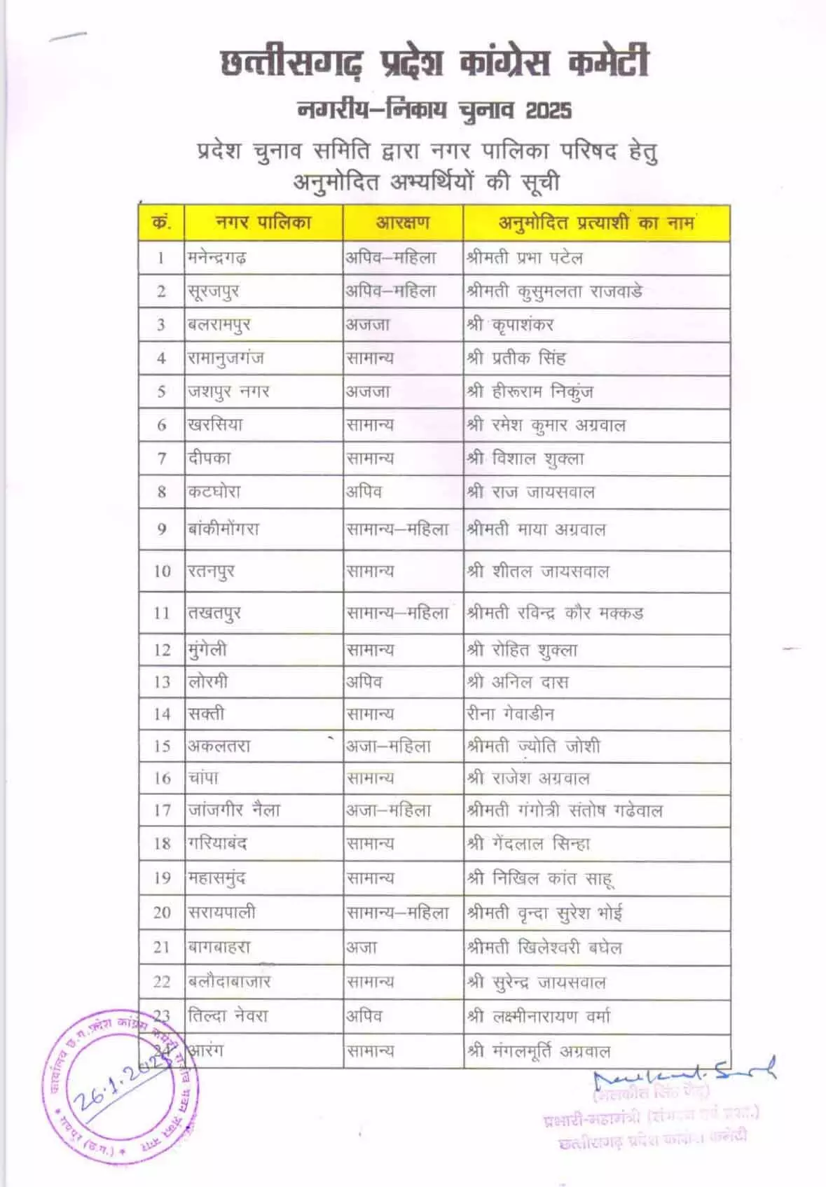 कांग्रेस ने नगर पालिका के लिए अध्यक्ष प्रत्याशियों की सूची जारी