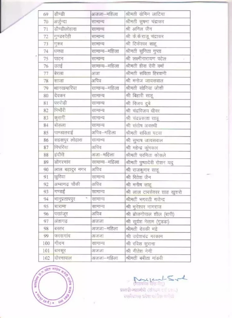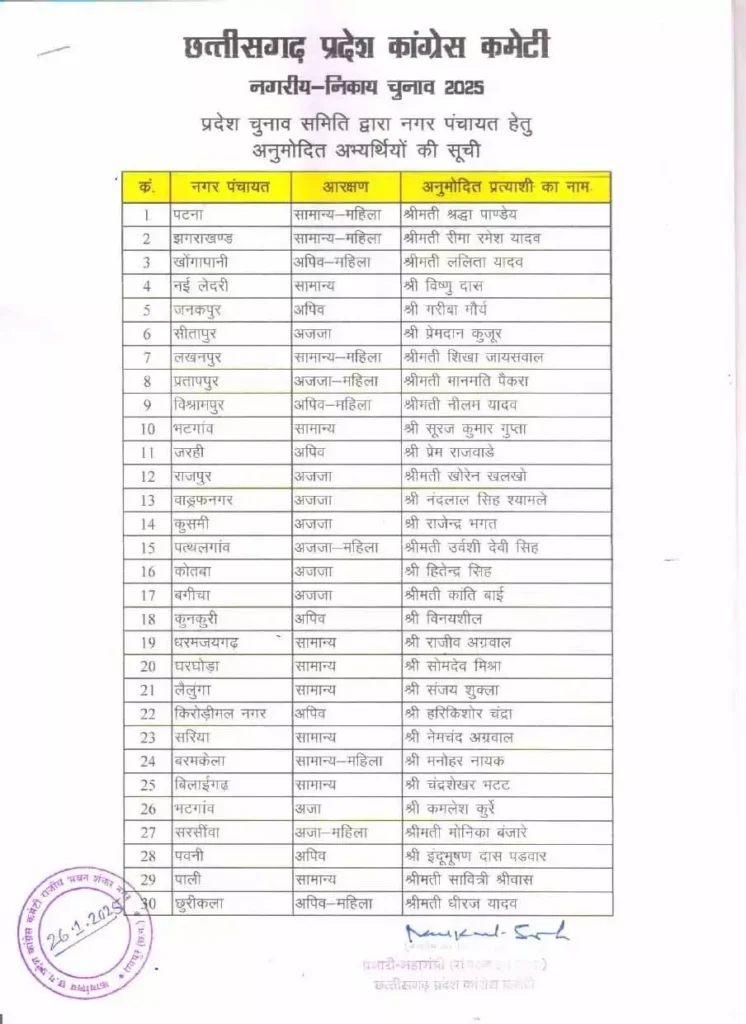 रायपुर। कांग्रेस ने महापौर, नगर पालिका, नगर पंचायत अध्यक्षों की सूची जारी की। रविवार को देर रात राजीव भवन में कांग्रेस की बैठक आयोजित की गई, जिसमें प्रभारी महासचिव सचिन पायलट की अध्यक्षता में प्रत्याशियों के नामों को फाइनल किया गया। इसके बाद यह लिस्ट जारी की गई है। बैठक में प्रदेश कांग्रेस अध्यक्ष दीपक बैज, पूर्व मुख्यमंत्री भूपेश बघेल, नेता प्रतिपक्ष चरणदास महंत, और अन्य वरिष्ठ नेता मौजूद रहे।