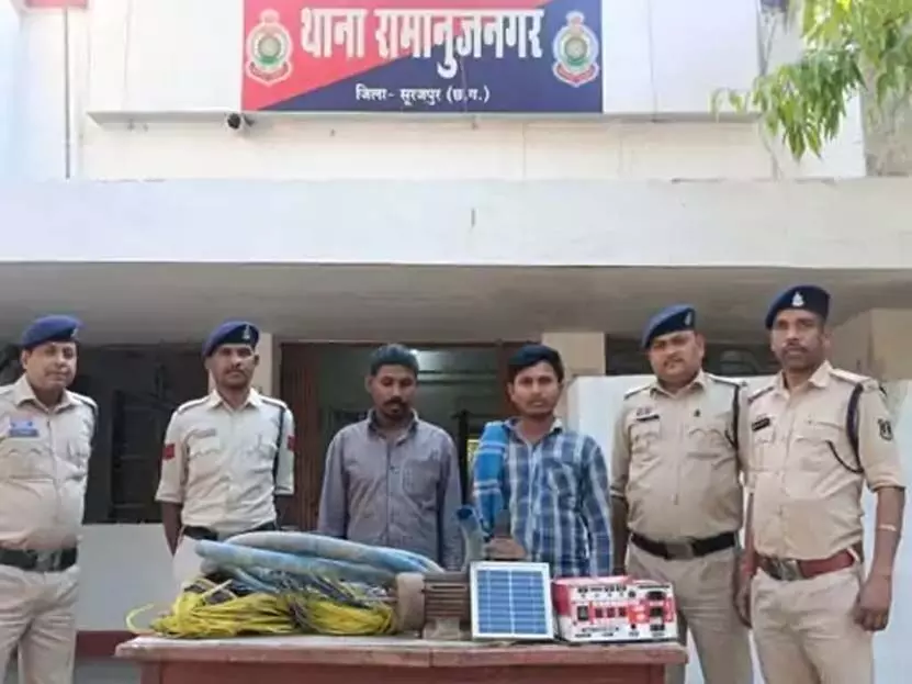 सूरजपुर। सूरजपुर पुलिस ने चोरी के अलग-अलग मामलों का खुलासा कर 6 आरोपियों को पकड़ा है। भटगांव थाना पुलिस ने चार आरोपियों को गिरफ्तार कर उनके पास से दो मोटरसाइकिल, कॉपर वायर और 10 किलो तांबा बरामद किया है। वहीं, दूसरा मामला रामानुजनगर थाना क्षेत्र का है। जहां कालीपुर निवासी तुलेश्वर प्रजापति के घर एक महीने पहले हुई चोरी मामले में दो संदिग्धों पकड़ाए है। आरोपियों ने पीड़ित के खेत से झटका मशीन, टूल्लू पम्प और तार चुराए थे जिसकी कीमत 15 हजार रुपए है।