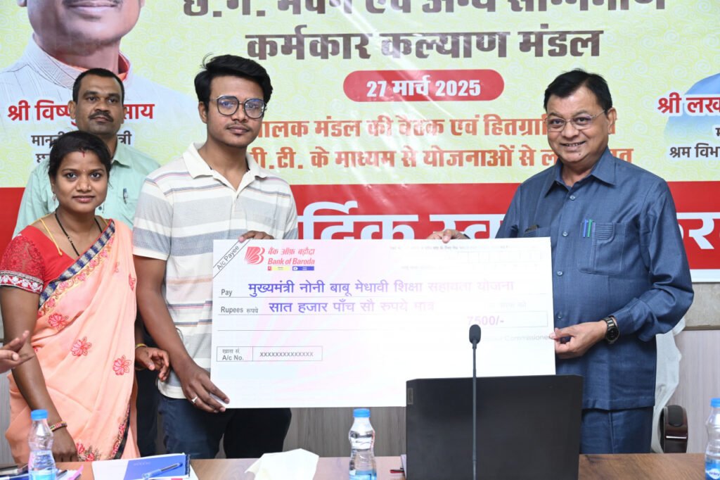 मुख्यमंत्री श्रमिक सियान सहायता योजना के अंतर्गत चंगोरा भाठा निवासी बिहारी लाल देवांगन एवं भवानी नगर कोटा रायपुर निवासी राही साहू को 20-20 हजार रूपए का चेक, मुख्यमंत्री नौनिहाल छात्रवृत्ति योजना तहत कुशालपुर निवासी लक्ष्मी सोनकर को 8 हजार रूपए, मुख्यमंत्री नोनी बाबू मेधावी शिक्षा सहायता योजना के तहत शैल सार्वे को 5 हजार का चेक प्रदान किया।