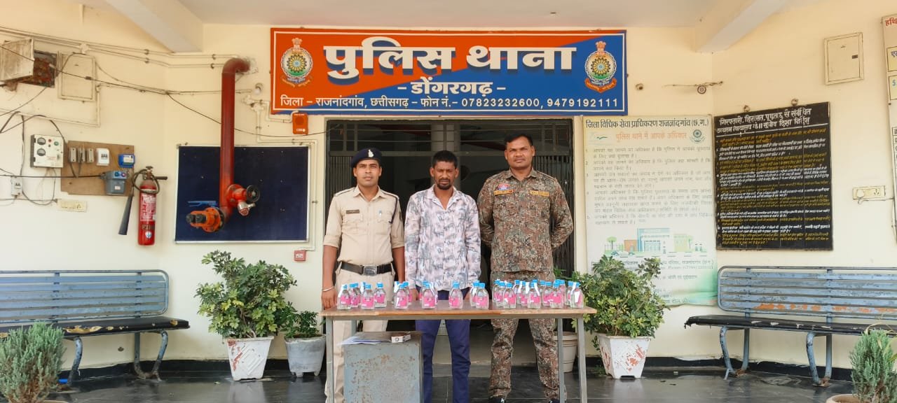 इसी कड़ी में दिनांक- 18.04.2025 को डोंगरगढ़ पुलिस को ईश्वर यादव नामक व्यक्ति छोटी बम्लेश्वरी मंदिर पास स्थित अपने घर के सामने अत्यधिक मात्रा में शराब रखकर अवैध रूप से शराब बिक्री कर रहा है कि सूचना पर डोंगरगढ़ पुलिस मौके पर पंहूचकर रेड कार्यवाही कर आरोपी के घर पिछे से एक सफेद रंग की बोरी में रखे 39 पौवा रोमियो देषी मदिरा प्लेन शराब प्रत्येक पौवा में 180-180 एम0एल0 शराब भरा हुआ शीलबंद कुल मात्रा- 7.020 बल्क लीटर किमती- 3120/-रू0 जप्त कर आरोपी के विरूद्ध धारा- 34(2) आबकारी एक्ट का अपराध दर्ज कर आरोपी को गिरफ्तार कर माननीय न्यायालय में पेश कर न्यायिक हिरासत में भेजा गया है। आरोपी आतदन अपराधी है इसके पूर्व आरोपी के विेरूद्ध थाना डोंगरगढ़ एव बोरतलाब में आबकारी अधिनियम एवं अन्य धराओं के तहत अपराध दर्ज है। आगे भी डोंगरगढ़ पुलिस का अवैध शराब बिक्री पर कार्यवाही जारी रहेगी।
