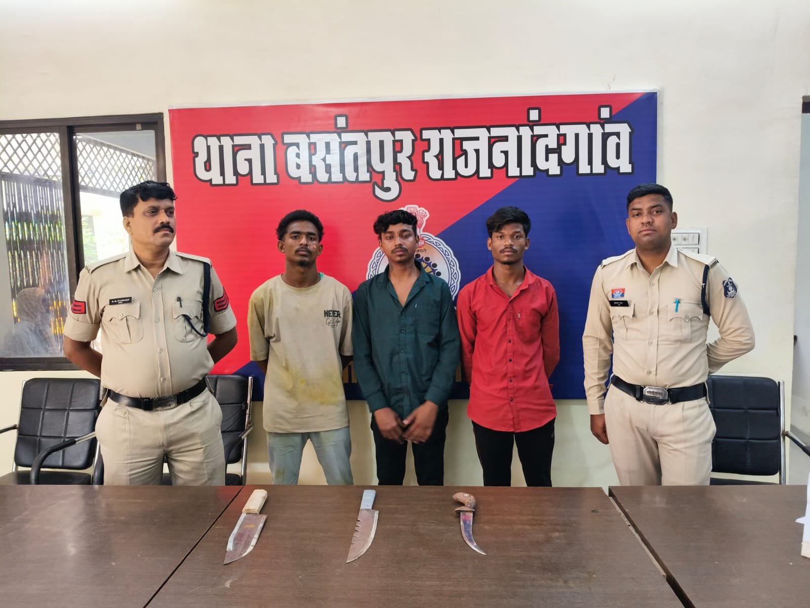 घटना का संक्षिप्त विवरण:- इस प्रकार है कि दिनांक 19.04.2025 को सूचना प्राप्त हुआ कि एक ब्लू डायमंड कॉलोनी के पास मोहारा रोड , दिग्विजय कॉलेज के पास सागरपारा एवं बांस डिपो के पास राजनांदगांव आम स्थान पर हाथ में धारदार चाकू रखकर व लहरा कर आने जाने वाले आमजन को डरा धमका कर भयभीत कर रहा है, कि सूचना पर निरीक्षक एमन साहू थाना प्रभारी थाना बसंतपुर के नेतृत्व में पृथक-पृथक टीम गठित कर कार्यवाही हेतु रवाना किया गया है। गठित टीम द्वारा अलग-अलग स्थानो से आरोपी वंश यादव, प्रदीप पटेल एवं रितेश यादव उर्फ लारो को धारदार चाकू लहराते हेतु रंगे हाथो पकडा गया। आरोपीगणो के कब्जे से लोहे का धारदार चाकू जप्त कर आरोपीगणो के विरूद्व आर्म्स आर्म्स एक्ट के तहत् कार्यवाही कर आरोपी को गिरफ्तार कर माननीय न्यायालय के समक्ष पेश किया गया। माननीय न्यायालय से आरोपी का जेल वारंट प्राप्त होने उपरान्त आरोपी को जिला जेल राजनांदगांव में दाखिल किया गया।