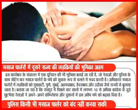 मसाज पार्लर चलाने वाले दावा करते हैं कि यह अवैध नेटवर्क छुटभैये नेताओं और पुलिस की मिलीभगत से बेखौफ तरीके से संचालित हो रहा है। जानकारी में यह भी सामने आया है कि शहर के कई मोहल्लों के छोटे नेताओं ने इस धंधे को अपनी कमाई का जरिया बना लिया है। पहले सट्टा और अन्य गैरकानूनी गतिविधियों से पैसा वसूलने वाले यह छुटभैया नेता अब मसाज पार्लरों से भी मोटी रकम उगाहते हैं। बाइक छोड़कर भागे अवैध व्यापार के प्रमुख अड्डे रायपुर शहर इस अवैध व्यापार में एक प्रमुख केंद्र बनकर उभरा है। सिविल लाइन, बैरन बाजार, कटोरा तालाब, राजा तालाब, पंडरी, शंकर नगर, तेलीबांधा और वीआईपी रोड जैसे क्षेत्रों में लगभग 100 से ज्यादा मसाज पार्लर सक्रिय हैं, जो कथित तौर पर देह व्यापार का अड्डा बने हुए हैं। सरकार को ठोस कदम उठाने की जरूरत अब सवाल यह है भारतीय जनता पार्टी की सरकार के गठन के बाद और प्रशासन के संज्ञान में आने के पश्चात इस अवैध व्यापार पर लगाम लगाने के लिए ठोस कदम उठाए जाएंगे। शहरवासियों के बीच इस अवैध धंधे को लेकर नाराजग़ी बढ़ती जा रही है और कई परिवारों में इस बात की शिकायत आम होती जा रही है कि उनके घर के युवक मसाज पार्लरों में समय और पैसा बर्बाद कर रहे हैं। अब देखना यह होगा कि नई सरकार इस गहरे और संगठित अवैध नेटवर्क पर अंकुश लगाने में कितनी गंभीरता दिखाती है। लड़कियों को वेतन नहीं देह व्य़ापार की मिलता है हिस्सा देह व्यापार का अड्डा बने मसाज पार्लर रायपुर समेत देशभर के कई मध्यमवर्गीय शहरों में मसाज पार्लरों के नाम पर खुलेआम देह व्यापार का धंधा संचालित होने का आरोप सामने आ रहा है। लड़कियों को नहीं मिलता तय वेतन मसाज पार्लरों में काम करने वाली लड़कियों को मासिक वेतन नहीं दिया जाता, बल्कि ग्राहक से मिलने वाली देहव्यापार की काली रकम का एक हिस्सा ही उनकी कमाई होती है। ग्राहक से एंट्री फ़ीस तय, अलग से सौदेबाज़ी मसाज पार्लर में एंट्री फ़ीस 1500 रुपये तक होती है। इसके बाद कैबिन में ग्राहक और लडक़ी के बीच सौदा तय होता है, जिसकी रकम 1000 से 5000 तक अलग-अलग तय होती है। बॉडी टू बॉडी मसाज के नाम पर बख़्शीश मसाज पार्लर में बॉडी टू बॉडी मसाज के बदले लड़कियों को अलग से बख़्शीश दी जाती है। यह भी उनकी आय का एक बड़ा हिस्सा बनता है। पुलिस और नेताओं से सेटिंग का खुला खेल मसाज पार्लर के संचालकों में ये चर्चा है कि हर मसाज पार्लर वाले पुलिस को 30,000 से 40,000 तक मंथली पेमेंट करता है। यह अवैध धंधा स्थानीय छुटभैया नेताओं और पुलिस की मिलीभगत से ही चलता है। छुटभैया नेताओं की कमाई का नया ज़रिया मोहल्लों के छुटभैया नेता, जो पहले सट्टे बाज़ार से वसूली करते थे, अब मसाज पार्लर से मोटी रकम ऐंठते नजर आ रहे हैं। रायपुर में मसाज पार्लरों की भरमार रायपुर शहर में अन