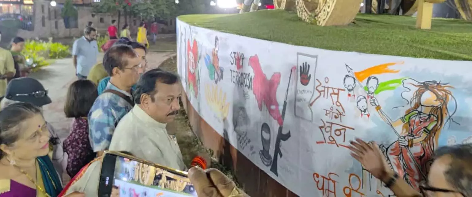 भिलाई। जम्मू-कश्मीर के पहलगाम में हुए आतंकवादी हमले के विरोध में सांसद विजय बघेल ने भिलाई, दुर्ग, खैरागढ़ के नामचीन कलाकारों द्वारा बनाई गई पेन्टिंग का अवलोकन किया। सिविक सेंटर के कृष्ण-अर्जुन रथ परिसर मे 100 फीट लंबे कैनवास पर बनाई गई पेन्टिंग को देखकर सांसद द्रवित हो उठे तथा भारत सरकार द्वारा आतंकवाद पर निर्णायक प्रहार की बात कही। उन्होंने कहा कि आतंकी पाताल में भी छुप जाएंगे तो भी उन्हें ढूंढकर मारा जाएगा उन्हें बख्शा नहीं जाएगा। इस दौरान बड़ी संख्या मे मौजूद कलाकारगण तथा आम नागरिकों ने कैंडल जलाकर शहीदों को नमन किया और पाकिस्तान मुर्दाबाद व आतंकवाद मुर्दाबाद के नारों से आसमान को गुंजायमान कर दिया।