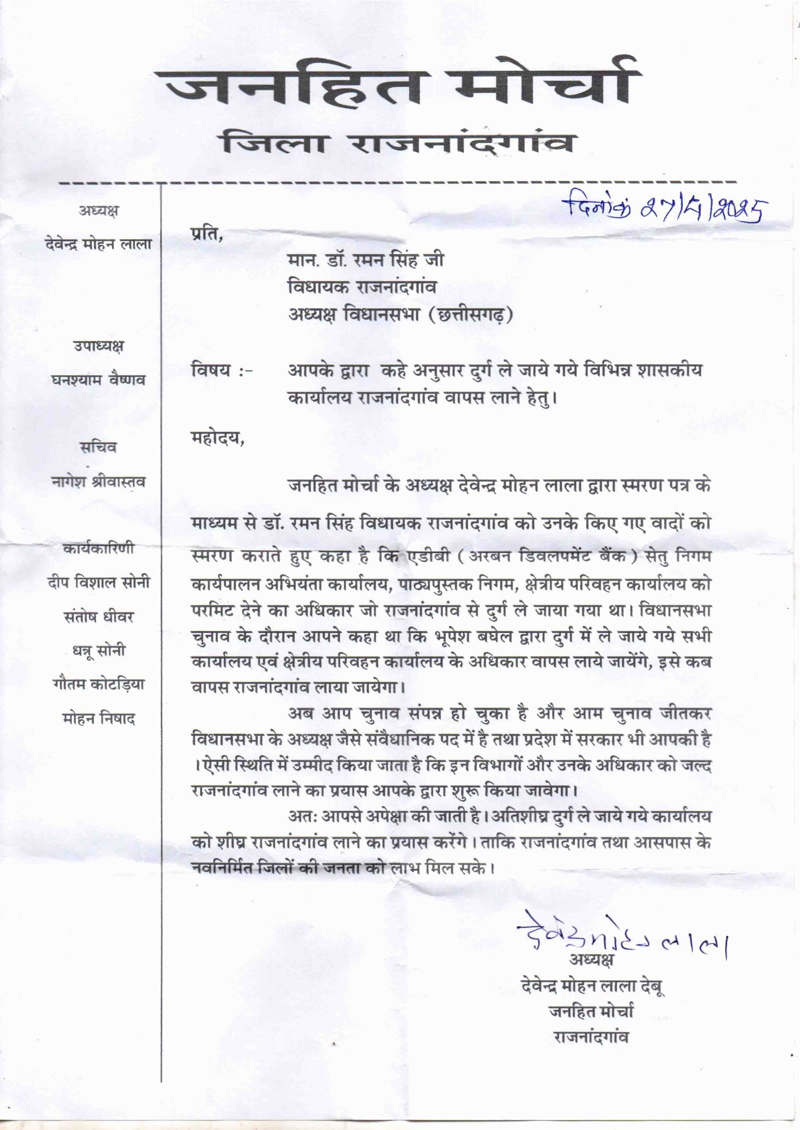 राजनांदगांव | जनहित मोर्चा के अध्यक्ष देवेन्द्र मोहन लाला देबू के द्वारा दिनांक 27.04.2025 को संध्या सीएम हाउस में स्मरण पत्र प्रेषित किया जिसमें एडीबी (अरबन डिवलपमेंट बैंक) सेतु निगम कार्यपालन अभियंता कार्यालय, पाठ्यपुस्तक निगम, क्षेत्रीय परिवहन कार्यालय को परमिट देने का अधिकार जो राजनांदगांव से दुर्ग ले जाया गया था हेतु ज्ञापन स्मरण पत्र प्रेषित किया। डॉ. रमन सिंह अध्यक्ष विधानसभा ने पत्र स्वीकार किया गया।