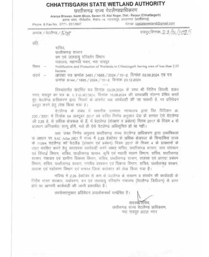 सिंघवी ने बताया कि आठ माह पूर्व उन्होंने 2.25 हेक्टर से छोटे तालाबों को चिन्हित कर अधिसूचित करने के लिए शासन को पत्र लिखा था जिस पर शासन ने वेटलैंड अथॉरिटी से पूछा कि इन तालाबों को बचाने के लिए नियमों के अंतर्गत क्या कार्रवाई की जा सकती है? वेटलैंड अथॉरिटी ने सात माह तक कोई जवाब नहीं दिया, सात माह पश्चात वेटलैंड अथॉरिटी ने शासन को बताया कि अभी वह बड़े तालाबों के चिन्हांकन में व्यस्त है और 2.25 हेक्टेयर से नीचे के छोटे तालाबों को चिन्हित करने का कार्य भविष्य में भारत सरकार पर्यावरण, वन एव जलवायु परिवर्तन मंत्रालय से निर्देश मिलने के पश्चात किया जाएगा। सिंघवी ने वेटलैंड अथॉरिटी के जवाब पर आपत्ति जताते हुए शासन को पत्र लिखा है कि भारत सरकार ने नियम अधिसूचित कर दिए हैं, बता दिया है कि राज्य की वेटलैंड अथॉरिटी को सभी तालाबों को चिन्हित करके नोटिफाई करना है। इसके बाद वेटलैंड अथॉरिटी को भारत सरकार के निर्देशों की जरूरत क्यों है? इसका साफ मतलब है कि वेटलैंड अथॉरिटी छोटे तालाबों की रक्षा करने के लिए इच्छुक नहीं है और उन्हें मरने के लिए छोड़ दिया है। सिंघवी ने मांग की है कि वेटलैंड अथॉरिटी को निर्देश किया जाए की 2.25 हेक्टर से छोटे तालाबों को समय सीमा में चिन्हित कर अधिसूचित किया जाए जिससे नियमों के तहत उन तालाबों को संरक्षित किया जावे।