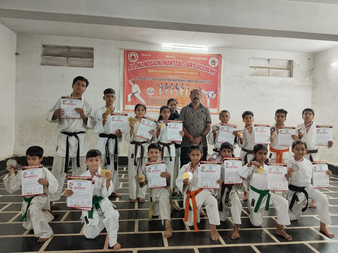 राजनांदगांव | भिलाई महिला महाविद्यालय में आयोजित नौवीं राज्य स्तरीय सब जूनियर, कैडेट एवं जूनियर कराते चैंपियन शिप का आयोजन छत्तीसगढ़ कराते डू एसोसिएशन के तत्वावधान मे किया गया जिसमें प्रदेश के बीस जिलों के कराटे इंडिया ऑर्गेनाइजेशन (के .आई.ओ.) से संबद्धता प्राप्त 400 खिलाड़ियों ने विभिन्न वजन वर्गों में भाग लिया। जिसमें राजनांदगांव जिला कराते संघ के खिलाड़ियों ने शिहान मुरली सिंह भारद्वाज के नेतृत्व में भाग लेकर शानदार प्रदर्शन कर 12 स्वर्ण पदक, 08 रजत पदक, एवं 04 कांस्य पदक जीतने में सफलता प्राप्त की ।