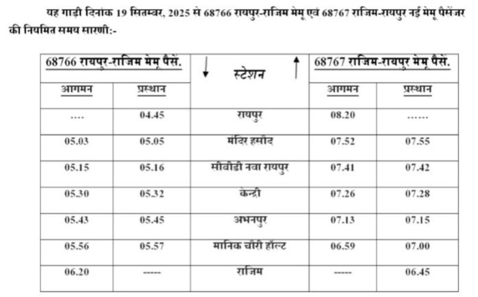 यह गाड़ी 06767 राजिम-रायपुर मेमू पैसेंजर स्पेशल सेवा का परिचालन राजिम रेलवे स्टेशन से दिनांक 18 सितम्बर, 2025 से शुभारंभ किया जाएगा । यह गाड़ी दिनांक 19 सितम्बर, 2025 से नियमित समय सारणी के अनुसार गाड़ी संख्या 68766/68767 रायपुर-राजिम-रायपुर मेमू पैसेंजर नई सेवा प्रतिदिन दोनों छोर से राजिम और रायपुर से संचालित की जाएगी ।