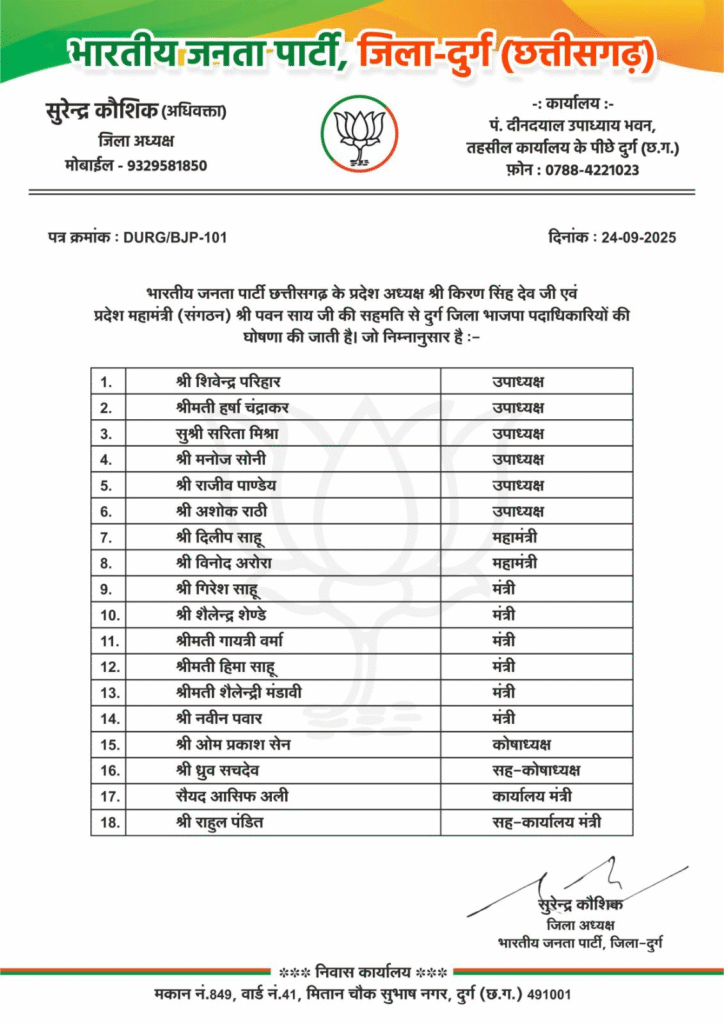 दुर्ग । दुर्ग जिले के संगठन को सशक्त बनाने तथा आगामी राजनीतिक गतिविधियों को ध्यान में रखते हुए जिला भाजपा पदाधिकारियों की घोषणा औपचारिक रूप से की जाती है। यह नियुक्तियाँ पार्टी की कार्यप्रणाली को और अधिक सशक्त व संगठित बनाने की दिशा में महत्वपूर्ण कदम साबित होंगी।