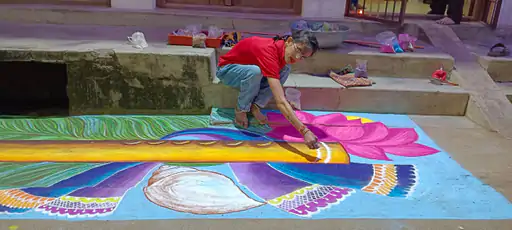 सविता देवांगन ने करीब 8 फीट लंबी और 4 फीट चौड़ी जगह में रंगोली से सुंदर बांसुरी बनाई जिसमें रंगों से कमल का फूलए मोर पंख की सजावट की। अनामिका ओझा ने भार भारत के नक्शा और उसमे अयोध्या धाम बना कर जय श्रीराम लिखा था। गोपी साहू ने एक सुंदर सिंह का चित्र रंगों से उकेराए नरेश छिपा ने श्री खाटू श्याम जी की रंगोली बनाई और इसमें तीन बाण के धारी लिखा। स्पर्धा को अ और ब ग्रुप में उम्र अनुसार बांटा गया था। इसमें प्रथम और द्वितीय पुरस्कार के अलावा सभी को सांत्वना पुरस्कार दिया गया।