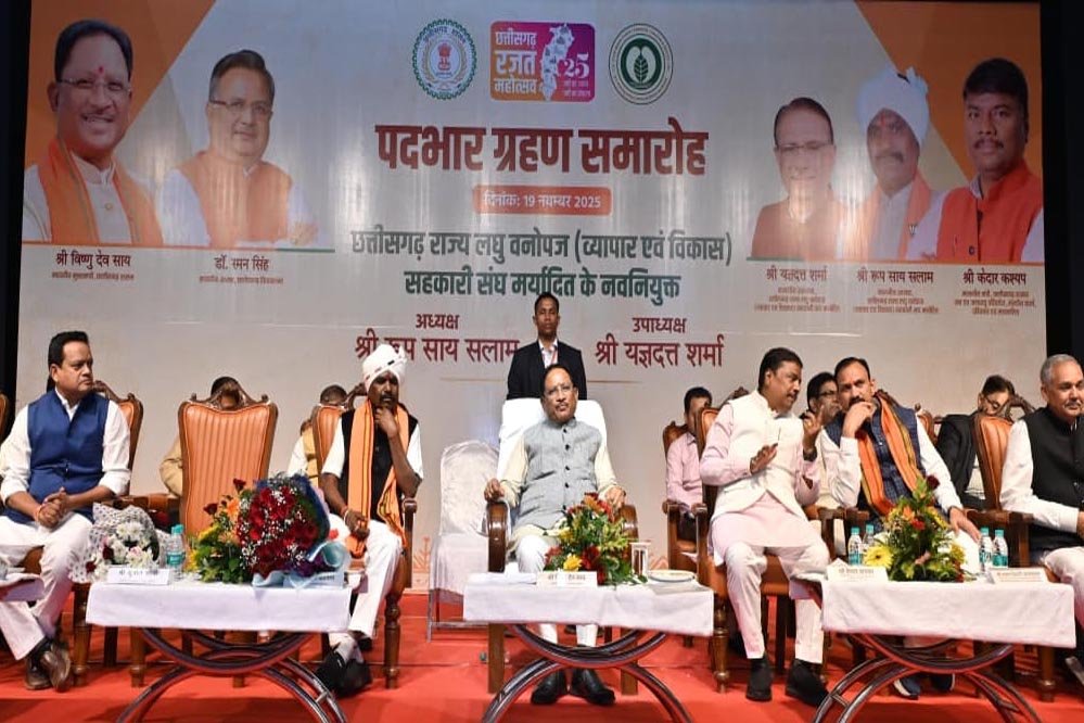 मुख्यमंत्री विष्णु देव साय आज राजधानी रायपुर स्थित मेडिकल कॉलेज सभागार में आयोजित छत्तीसगढ़ राज्य लघु वनोपज (व्यापार एवं विकास) सहकारी संघ मर्यादित के नवनियुक्त अध्यक्ष रूप साय सलाम और उपाध्यक्ष यज्ञदत्त शर्मा के पदभार ग्रहण कार्यक्रम में शामिल हुए। उन्होंने नए दायित्वों के लिए अध्यक्ष तथा उपाध्यक्ष को हार्दिक बधाई और शुभकामनाएं दीं।