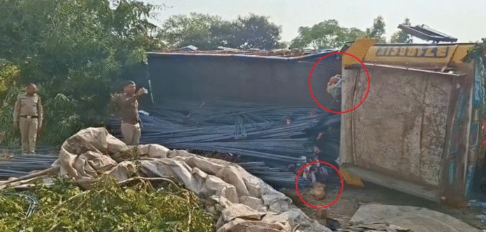 बेमेतरा । छत्तीसगढ़ के बेमेतरा जिले में देर रात हुआ सड़क हादसा एक बड़ी तस्करी के खुलासे में बदल गया। रायपुर से प्रयागराज जा रहा लोहे की छड़ लेकर निकला एक ट्रक ग्राम बैजी के पास अनियंत्रित होकर पलट गया। घटना के बाद ट्रक चालक मौके से भाग गया।