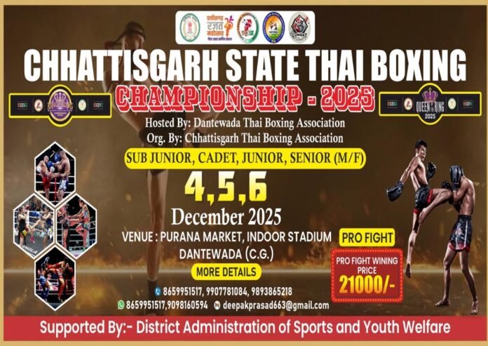 जिला प्रशासन एवं खेल एवं युवा कल्याण विभाग के तत्वावधान में राज्य स्तरीय थाई बॉक्सिंग चैंपियनशिप–2025 का आयोजन पुराना मार्केट स्थित इंदिरा स्टेडियम, दंतेवाड़ा में जारी है। दो दिवसीय यह प्रतियोगिता सब जूनियर, कैडेट, जूनियर एवं सीनियर प्रो फाइट (बालक/बालिका) वर्ग में हो रही है, जिसमें प्रदेश के विभिन्न जिलों से आए खिलाड़ी भाग ले रहे हैं।