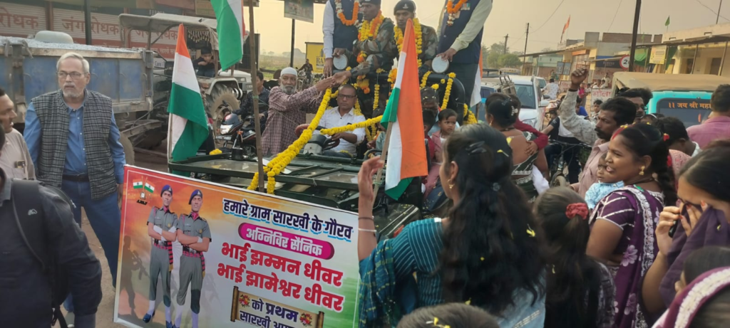 रायपुर। राजधानी से लगे ग्राम सारखी के श्री मंगल धीवर के दोनों बेटे झम्मन धीवर और झामेश्वर धीवर का अग्निवीर में चयन हुआ। ट्रेनिंग के उपरांत पहली बार गांव आने पर पूरे गांव वालों ने उनके स्वागत में पलख पांवड़े बिछा दिए थे। मुख्य मार्ग में गांव तक बाजे गाजे एवं फूलों से लाद दिया गया था।