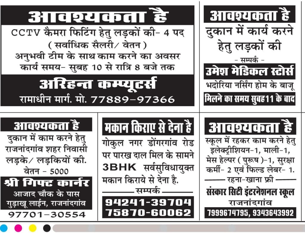 राजनांदगांव में युवाओं के लिए नौकरी के कई अवसर खुले हैं। विभिन्न प्राइवेट दुकानों और संस्थानों में सेल्स, कंप्यूटर ऑपरेटर, होटल स्टाफ और अन्य पदों पर भर्ती की जा रही है। इच्छुक अभ्यर्थी सीधे संपर्क कर सकते हैं। Job Job Job! राजनांदगांव में प्राइवेट दुकानों में निकली बंपर वैकेंसी…… युवाओं के लिए नौकरी के अवसर