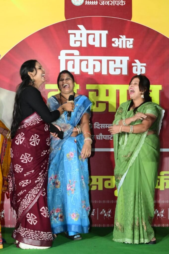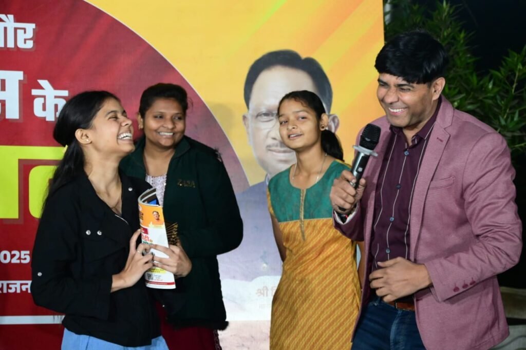 छत्तीसगढ़ में खेल के संबंध में इशारों में प्रश्र पूछने पर नव्यांश ने बस्तर ओलंपिंक बताकर अपनी सूझबूझ का परिचय दिया। प्रतिभागियों ने जल जीवन मिशन, हरेली, धान खरीदी, कृषक उन्नति योजना से संबंधित प्रश्रों के उत्तर दिए। आरजे अनिमेष एवं योगिता ने अपनी हाजिर जवाबी से सभी को खूब हंसाया। अरूणा साहू, भावना साहू एवं पिंकी साहू तीनों बहनों ने टंग ट्विस्टर में भाग लिया, महफिल में रंग जमाया। नन्ही बालिका नव्या ने राम आएंगे… और घमेन्द्र साहू, निखिल जैन ने एक प्यार का नगमा है… सुमधुर गीत सुनाया। आरजे अनिमेष ने सभी को शासन की योजनाओं एवं कार्यक्रमों के संबंध में जानकारी दी। उन्होंने सभी को शासन की योजनाओं की जानकारी प्राप्त करने के लिए जनसंपर्क विभाग के पोर्टल से जुडऩे कहा।