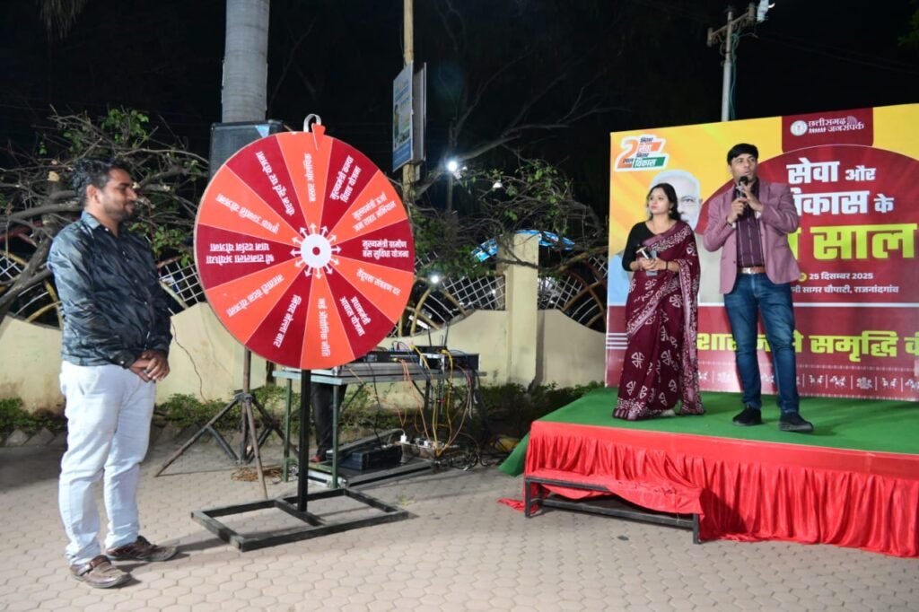 राजनांदगांव। सरकार के 2 वर्ष पूर्ण होने के उपलक्ष्य में जनसंपर्क विभाग द्वारा राजनांदगांव शहर के रानी सागर स्थित चौपाटी में 2 साल निरंतर सेवा निरंतर विकास कार्यक्रम का आयोजन किया गया। कार्यक्रम उमंग, उत्साह एवं खुशनुमा माहौल में संपन्न हुआ। इस अवसर पर छत्तीसगढ़ी सांस्कृतिक कार्यक्रम के साथ ही विभिन्न रोचक गतिविधियों का आयोजन किया गया। इस दौरान छत्तीसगढ़ी संस्कृति पर आधारित प्रश्र पूछे गए। जिसमें शहरवासियों की सक्रिय सहभागिता रही। प्रधानमंत्री सूर्यघर मुफ्त बिजली योजना के हितग्राही हेमंत पाण्डे ने अपने अनुभव साझा करते हुए बताया कि इस योजना से घर में सोलर पैनल लगाने से बिजली बिल शून्य हो गया है।