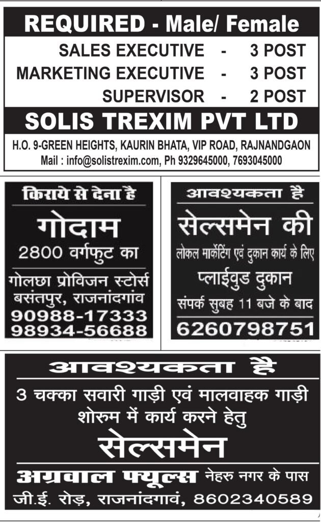 राजनांदगांव में युवाओं के लिए नौकरी के कई अवसर खुले हैं। विभिन्न प्राइवेट दुकानों और संस्थानों में सेल्स, कंप्यूटर ऑपरेटर, होटल स्टाफ और अन्य पदों पर भर्ती की जा रही है। इच्छुक अभ्यर्थी सीधे संपर्क कर सकते हैं। Job Job Job! राजनांदगांव में प्राइवेट दुकानों में निकली बंपर वैकेंसी…… युवाओं के लिए नौकरी के अवसर