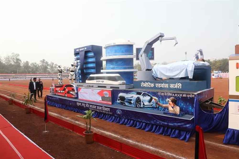 झांकी में आगे आधुनिक इलेक्ट्रिक परिवहन, रोबोटिक्स एवं ऑटोमेशन, मेगा इनक्यूबेशन/इनोवेशन सेंटर, हेल्थ-टेक, शिक्षा एवं कौशल विकास में एआर/वीआर तकनीक तथा स्टार्टअप्स की विकास यात्रा को IDEA → PROTOTYPE → GTM (Go-To-Market) → SCALE चरणों के माध्यम से प्रभावी रूप से प्रदर्शित किया गया। अंतिम दृश्य में आधुनिक बुलेट ट्रेन के माध्यम से तेज, सतत एवं भविष्य उन्मुख औद्योगिक विकास का प्रतीकात्मक चित्रण किया गया।