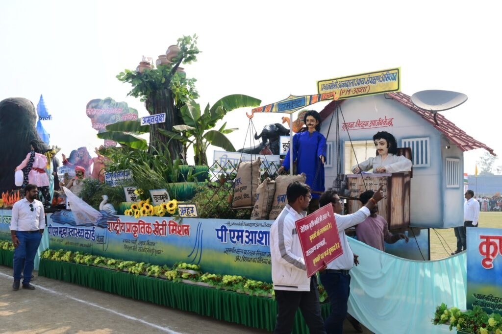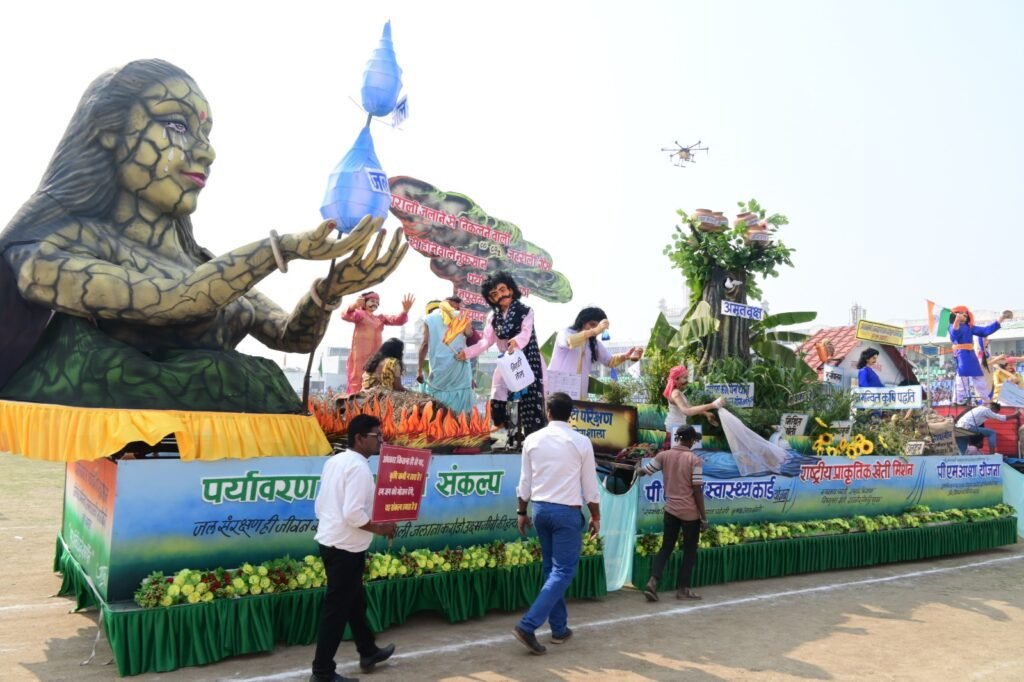 राजनांदगांव । गणतंत्र दिवस के अवसर पर दिग्विजय स्टेडियम राजनांदगांव में आयोजित जिला स्तरीय मुख्य समारोह में शासन की जनकल्याणकारी योजनाओं पर आधारित कृषि विभाग की चलित झांकी प्रथम स्थान पर रही। कृषि विभाग द्वारा पर्यावरण को दूषित करने वाले प्लास्टिक के न्यूनतम उपयोग से चलित झांकी तैयार की गई थी। झांकी में कृषक उन्नति योजना के तहत किसानों से 3100 रूपए प्रति क्विंटल की दर और प्रति एकड़ 21 क्विंटल तक के मान से धान खरीदी, प्रधानमंत्री किसान सम्मान निधि से किसानों की आर्थिक समृद्धि, नमो ड्रोन दीदी के माध्यम से महिला कृषकों को तकनीकी दक्षता के साथ आय का विकल्प, प्राकृतिक कृषि पद्धति के विभिन्न आयाम, प्रधानमंत्री अन्नदाता आय संरक्षण अभियान (पीएम आशा) के माध्यम से दलहनी व तिलहनी फसलों का समर्थन मूल्य पर खरीदी, प्रधानमंत्री मृदा स्वास्थ्य कार्ड योजना के माध्यमय से प्रयोगशाला में मृदा परीक्षण, राष्ट्रीय खाद्यान्न सुरक्षा योजना, राष्ट्रीय प्राकृतिक खेती मिशन, तिलहन मिशन के माध्यम से तिलहन फसलों के क्षेत्र में वृद्धि तथा समन्वित कृषि प्रणाली एवं दलहन,तिलहन, लघु धान्य व पुष्प की खेती का जीवंत प्रदर्शन किया गया था। साथ ही पराली जलाने से निकलने वाले जहरीले धुंओं से मानव स्वास्थ्य पर पडऩे वाले दुष्प्रभाव एवं भू-जल के अंधाधुंध सिंचाई व बिना जल संरक्षण के जल के अंधाधुंध दोहन से धरती पर पड़ रहे बोझ का प्रतीकात्मक प्रदर्शन कर नागरिकों को जागरूक किया गया।
