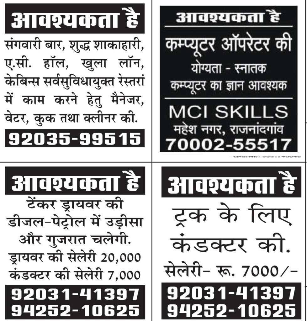 राजनांदगांव में युवाओं के लिए नौकरी के कई अवसर खुले हैं। विभिन्न प्राइवेट दुकानों और संस्थानों में सेल्स, कंप्यूटर ऑपरेटर, होटल स्टाफ और अन्य पदों पर भर्ती की जा रही है। इच्छुक अभ्यर्थी सीधे संपर्क कर सकते हैं। Job Job Job! राजनांदगांव में प्राइवेट दुकानों में निकली बंपर वैकेंसी…… युवाओं के लिए नौकरी के अवसर