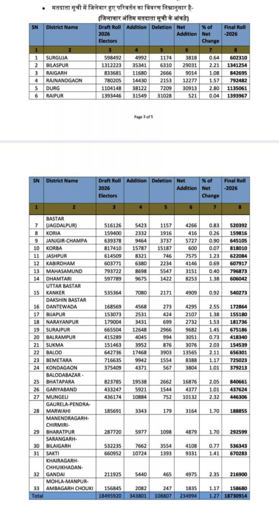 रायपुर, भारत निर्वाचन आयोग, नई दिल्ली के निर्देशानुसार छत्तीसगढ़ राज्य में निर्वाचक नामावलियों का विशेष गहन पुनरीक्षण (एसआईआर) अभियान शुरू किया गया है। राज्य भर में दिनांक 27 अक्टूबर 2025 से शुरू हुए और चार महीने तक लगातार चले एसआईआर (विशेष गहन पुनरीक्षण) अभियान के विभिन्न चरणों के प्रभावी संचालन के बाद आज दिनांक 21.02.2026 को निर्वाचक नामावली की अंतिम प्रकाशन किया गया। मतदाता सूची में अपना नाम शामिल कराने, मतदाता सूची से अपना नाम हटवाने या प्रविष्टियों में संशोधन से संबंधित दावे और आपत्तियां दिनांक 23.12.2025 से 22.01.2026 के बीच प्रस्तुत किए गए थे। प्राप्त दावे आपत्तियों का निराकरण दिनांक 14 फरवरी 2026 तक किया गया।