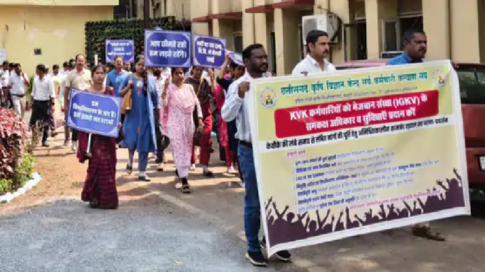 राजनांदगांव/ उपरवाह , छत्तीसगढ़ राज्य में इंदिरा गांधी कृषि विश्वविद्यालय के अधीन संचालित कृषि विज्ञान केंद्रों के अधिकारी/कर्मचारी अपनी वेतन विसंगति, अपूर्ण वेतन भुगतान एवं वैधानिक सेवा-लाभों की बहाली की मांग को लेकर जारी अनिश्चितकालीन कामबंद हड़ताल सह धरना-प्रदर्शन के जारी है। संघ द्वारा 16 से 20 फरवरी तक आयोजित पांच दिवसीय कामबंद हड़ताल के दौरान विश्वविद्यालय प्रशासन से स्पष्ट, लिखित व समयबद्ध समाधान की अपेक्षा की गई थी।