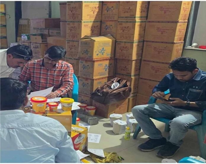 नयागांव टैंकर रोड स्थित ग्लोबस सिटी कालोनी में शुक्रवार दोपहर एक मकान में बड़ी मात्रा में नकली घी की आशंका में प्रशासन व खाद्य विभाग की संयुक्त टीम ने दबिश देकर कार्रवाई की। मौके से 1610 लीटर घी जब्त कर मकान के एक कमरे में रख सील कर दिया है। घी उत्तर प्रदेश के मुजफ्फरपुर की दो कंपनियों से मंगाकर रतलाम में देशी घी के नाम पर बाजार में बेचा जा रहा था।
