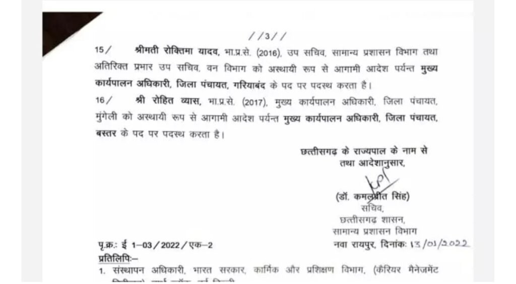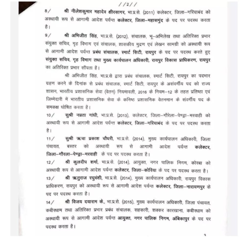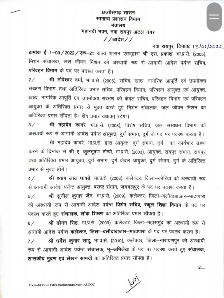 Uncategorized CG- कुल 16 आईएएस का तबादला, कावरे दुर्ग और धावड़े बस्तर संभाग आयुक्त बनाए गए.. Deep Jagriti January 13, 2022 (Last updated: January 13, 2022) 1 minute read 0 comments रायपुर , 13 जनवरी 2022- राज्य सरकार ने आज कुछ आईएएस के ट्रांसफर किये । देखिये आदेश जिलों के कलेक्टरों समेत 16 आईएएस अधिकारियों का ट्रांसफर किए है। About the Author Deep Jagriti Administrator Visit Website View All Posts Post navigation Previous: राजनांदगांव: जिलेे में फूटा कोरोना बम- शहर में मिले 171 कोरोना संक्रमित मरीज, एक की मौतNext: मुख्यमंत्री ने किया दैनिक नवप्रदेश के वार्षिक कैलेंडर का विमोचन Leave a Reply Cancel replyYour email address will not be published. Required fields are marked *Comment * Name * Email * Website Save my name, email, and website in this browser for the next time I comment. Related Stories Uncategorized आज का राशिफल Deep Jagriti March 14, 2026 0 Uncategorized आज का राशिफल : इन राशियों के लिए दिन रहेगा शुभ, जानिए मेष से लेकर मीन राशि वालों का 13 मार्च का राशिफल Deep Jagriti March 13, 2026 0 Uncategorized आज का राशिफल : मेष और कर्क समेत इन चार राशियों के खुल सकते हैं किस्मत के दरवाजे Deep Jagriti March 12, 2026 0