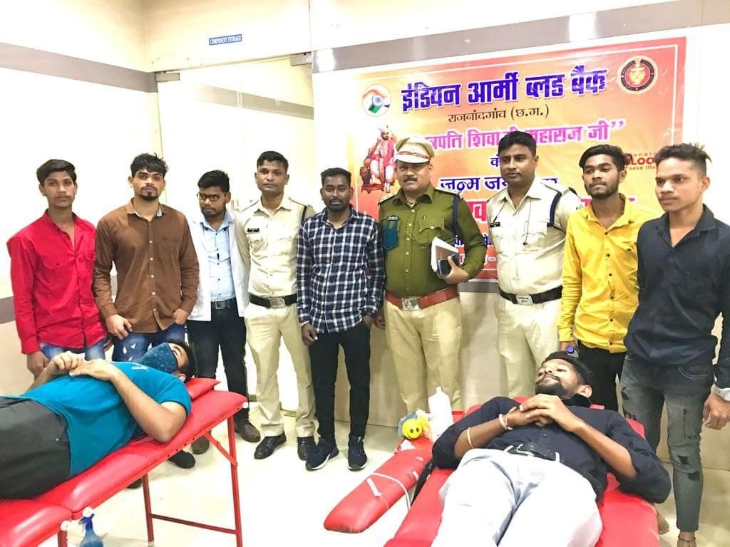 राजनांदगांवः छत्रपति शिवाजी महाराज के जन्मजंयती पर इंडियन आर्मी बल्ड बैंक राजनांदगांव के द्धारा रक्तदान शिविर का आयोजन किया गया जिसमें 30 यूनिट विद्यार्थियों द्धारा किया गया साथ इस कार्यक्रम में मुख्य रूप से बसंतपुर के थाना प्रभारी श्री राजेश साहू ने नगर पुलिस अधीक्षक श्री संतोष सिंह के नेतृत्व में निजात अभियान चलाया जा रहा है जिसका जानकारी साझा किया गया । नशीली पदार्थों का सेवन से लगातार बढते अपराध को रोकने के लिए दिशा निर्देश दिए गए। तथा शिक्षा के प्रति एक नई पहल के तहत रक्तदान करने वाले युवाओं को प्रवेश परीक्षा के तैयारी में लगने वाले पुस्तक देकर सम्मान किया गया।